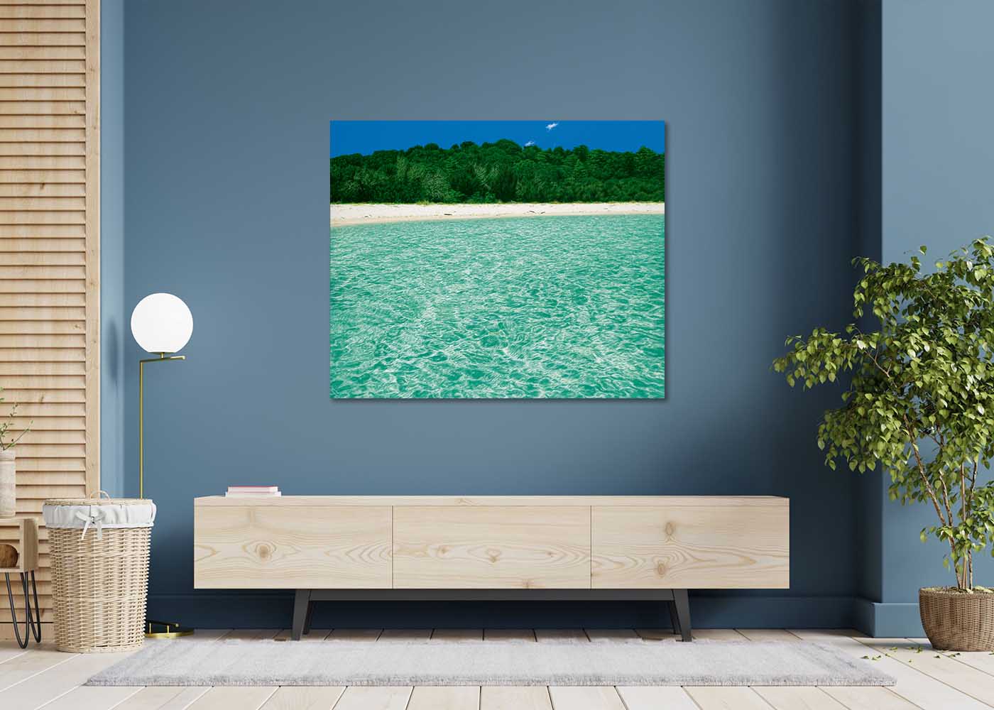 Across the shimmering, shallow water, towards a stretch of bright sand and the lush vegetation behind it, your attention is captured by a couple of tiny white clouds as they drift weightlessly through the clear summer sky.