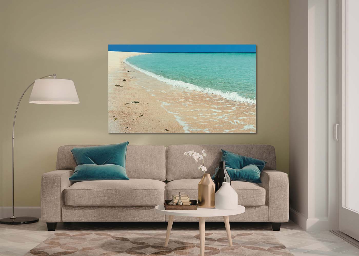 A sun drenched sweep of sand and shimmering water that holds and reflects back the light. A scene that will brighten up any room and makes you want to get your shades out, even on a rainy day!