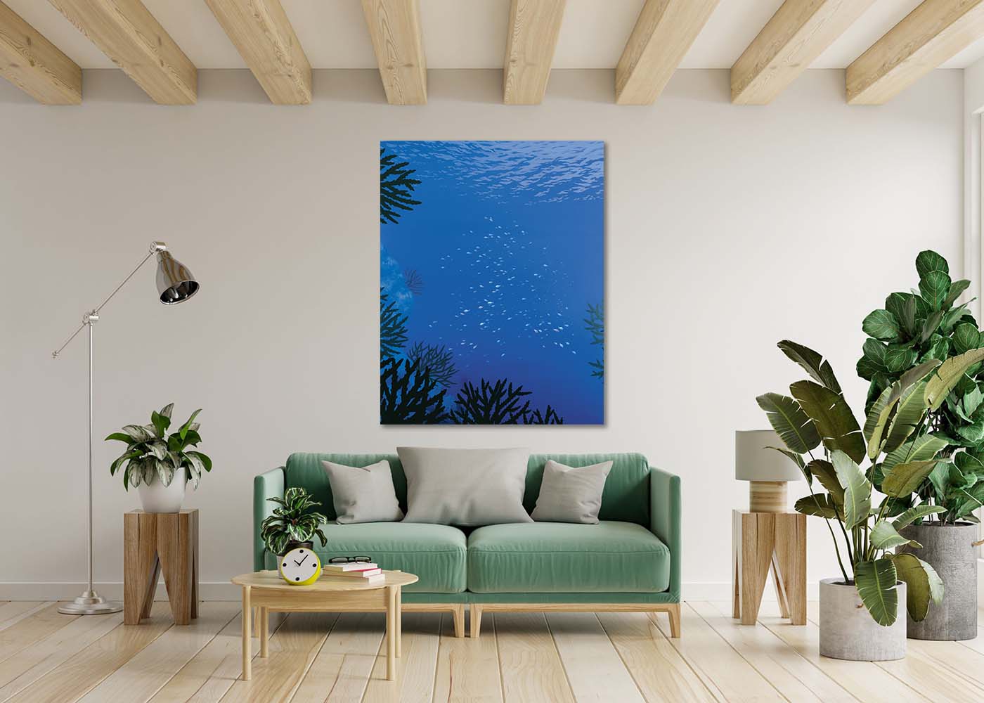 A dreamy underwater scene framed by rocks and coral, and a surprise encounter with dozens of small fish that lead the eye all the way into the blue distance.