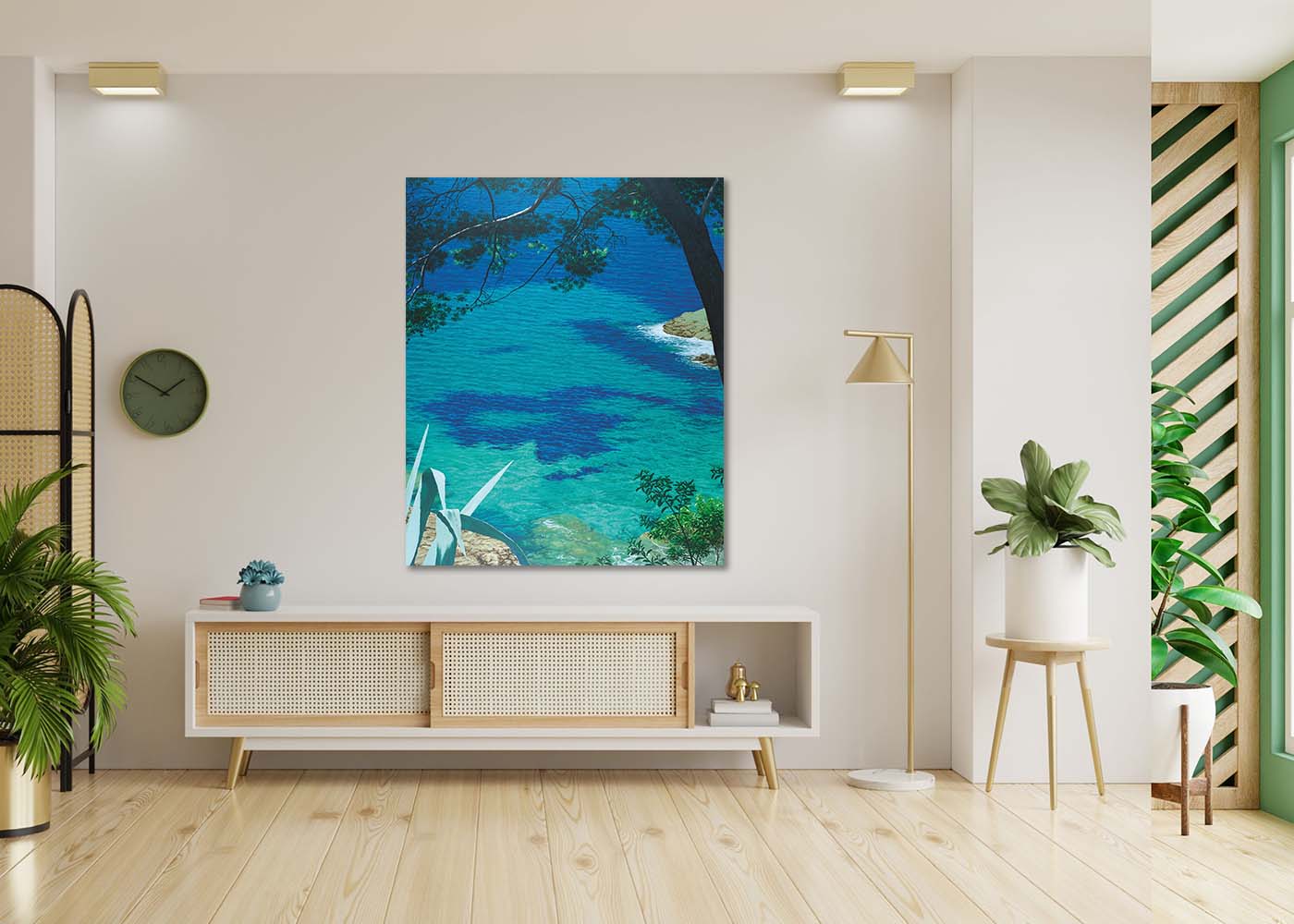 A scene from a coastal path that follows the shoreline around little bays and headlands. From the shady vantage point, Mediterranean plants frame the view onto the water that intrigues with a multitude of shades from lightest turquoise to darkest blue.