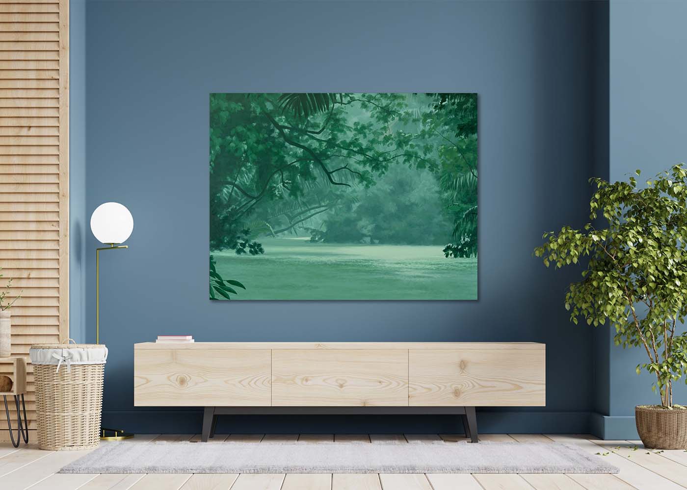 Moody and mysterious, a river makes its way through the steamy rainforest. You can almost hear the rain. You will wonder what lies around the next bend. You will find yourself drawn into this world of dripping leaves.