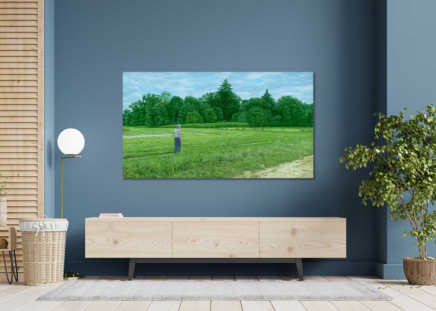 A view of a wood from the outside, and a man standing in the field leading up to the wood. While the scene itself provides plenty of interest, the focus are the dynamics between the person and what he is looking at. It makes you wonder why he is even standing there, and what might happen next. A piece of great calm and intrigue.