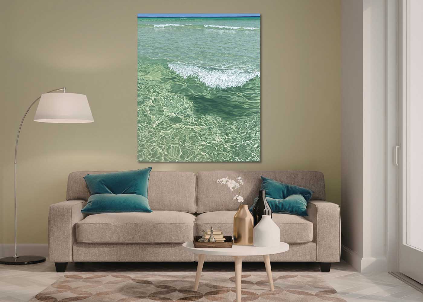 From a perspective of the shallow water, with gently breaking waves, this dynamic scene captures one moment of the endlessly changing patterns of sun reflecting off the water and the sand below.