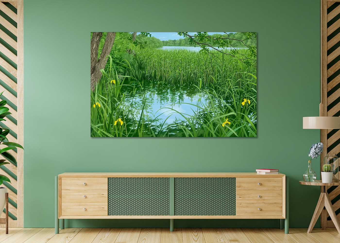A stunning little scene at the edge of a lake, with the emerging reeds and wild irises all competing for light. The intense shades of green contrast beautifully with the yellow of the flowers, while a bit of water takes centre stage with some lovely reflections of the sky.